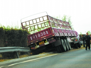 事發(fā)地點(diǎn)位于京承高速出京方向10公里處黃港路段。肇事車(chē)輛是一輛“蒙”字牌照的大貨車(chē)。大貨車(chē)?yán)藵M(mǎn)滿(mǎn)一車(chē)鋼筋盤(pán)條,因?yàn)橐活^“騎上”了隔離帶,車(chē)頭和車(chē)身幾乎被“解體”,左側(cè)車(chē)廂廂壁被鋼筋盤(pán)條撞開(kāi),十余捆鋼筋盤(pán)條散落在反方向的路面上,占據(jù)了兩條車(chē)道。
