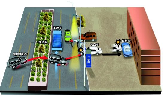 2時53分01秒,一輛工程車由南往北駛過。5秒后,一輛黑色越野車突然由西向東從綠化帶中飛了出來。