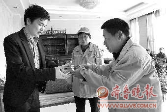 解福勝(右一)和李樹香一起將3.7萬(wàn)元現(xiàn)金交還給酒店負(fù)責(zé)人。 本報(bào)記者 黃廣華 攝