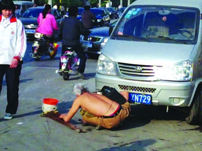 “一開始看到這個乞丐,光著上身,在馬路的車流上爬行,就覺得非常危險。”圖片的拍攝者趙先生告訴記者,最初他完全是覺得這個乞丐這樣容易被車撞到。“當時在玄武區月苑菜場門口看到他,不顧車來車往就在鬧市區爬來爬去。背上背著喇叭乞討,形象慘不忍睹。”趙先生表示,乞丐看起來非常悲慘,于是就上去勸阻他不能在這么危險的地方乞討。“他當時裝作聽不清楚講話,我反復勸也沒有用,就算了。”