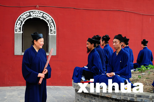 吳誠真方丈(左一)指導弟子們打坐修行內丹(5月9日攝)。新華社記者 程敏 攝