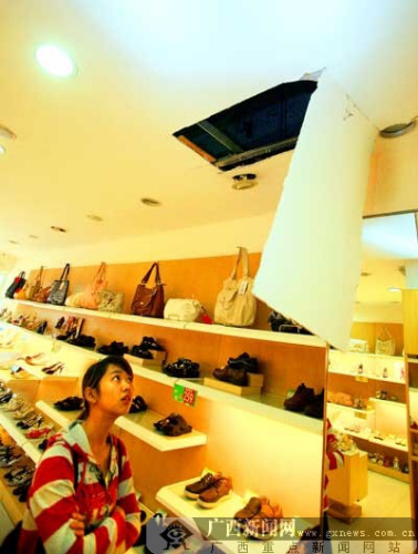 昨日上午9時(shí),店員陳小姐來到鞋包專賣店,卷閘門像往常一樣好好鎖著;開門進(jìn)去,店內(nèi)的擺設(shè)似乎也沒有任何異常。可是剛往前走了幾步,陳就看到了天花板上兀然出現(xiàn)的兩個(gè)大窟窿。