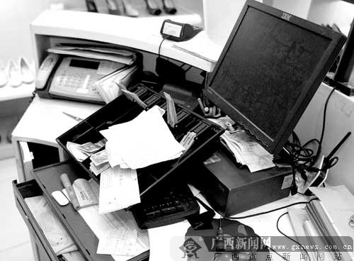收銀臺(tái)被砸壞的抽屜,一些毛票和單據(jù)凌亂不堪地放在桌上。記者唐寅 攝