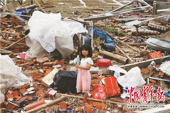 6月24日,江蘇省阜寧縣新溝鎮大樓村,5歲的小女孩晏四瑾在自家垮塌房屋的廢墟上。中國青年報·中青在線記者陳劍攝