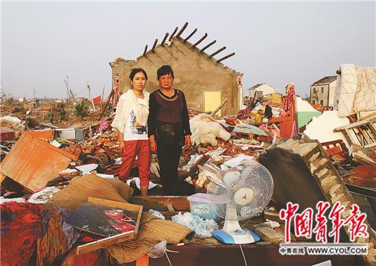 6月25日,江蘇省阜寧縣陳良鎮丹平村,50歲的周琴(右)和兒媳婦劉麗麗在自家垮塌房屋的廢墟前。中國青年報·中青在線記者陳劍攝