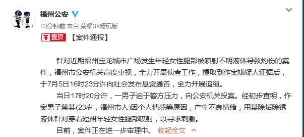 當日17時20分許,一男子迫于警方壓力,向公安機關投案。經初步查明,作案男子蔡某(23歲,福州市人)因個人情感等原因,產生不良情緒,用某除垢除銹液體針對穿著短裙年輕女性腿部噴射,以尋求刺激。