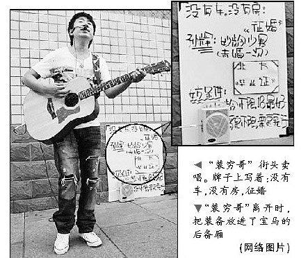 “裝窮哥”街頭賣唱。牌子上寫著:沒有車,沒有房,征婚
