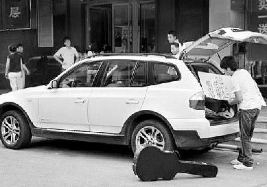 “裝窮哥”離開時,把裝備放進了寶馬的后備廂