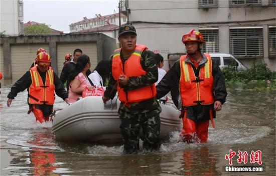 7月6日,湖北省漢川市城隍鎮一小區被淹,大量人員被困。由于積水已漫過樓道,橡皮艇無法靠近,為避免被困人員落水,消防官兵拱起大腿,架起“橋梁”,幫助被困人員轉移。在淺水區,消防官兵抱起孩子,背起老人、婦女,將其轉移到安全地帶。經過3個多小時的營救,消防官兵往返多次,成功轉移45名被困人員。王基達 攝