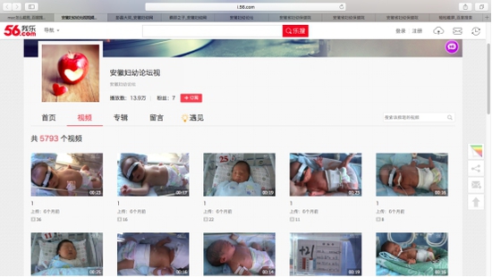 記者發(fā)現(xiàn),該視頻的上傳者為“安徽婦幼論壇視”,該賬號共上傳了5793個視頻在56網(wǎng)上,全是新生兒的視頻,很多視頻名字直接用“某某”之子、“某某”之女標注。點開后,視頻里的孩子眼睛被蒙著,但其他的信息非常清晰,就連診斷癥狀黃疸、早產(chǎn)等也一覽無余。