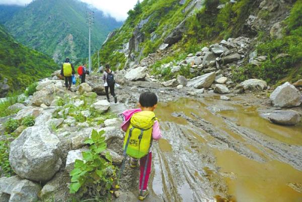 由于下雨,石頭有些濕滑,潘土豐抱著雯雯,緩緩前行,每一步,得先用腳試著踩一下,確定踩實了,再下腳。除了石頭路,還有泥巴路!斑@段路,我們走了一個多星期才走完。”雖然沿途驚險重重,好在,一家人平安到達終點。
