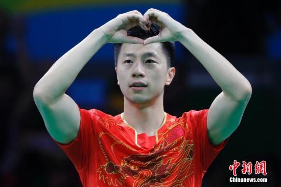 8月11日,里約奧運會乒乓球男子單打決賽,馬龍戰勝衛冕冠軍張繼科奪得冠軍,成為世界上第五個實現大滿貫的男子選手。圖為馬龍手比心形慶祝。中新網記者 盛佳鵬 攝