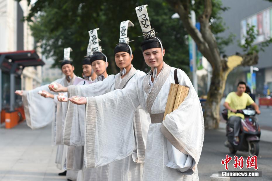 9月8日,一群身著中國(guó)春秋戰(zhàn)國(guó)時(shí)期服飾的年輕人出現(xiàn)在南京街頭,一邊誦讀詩(shī)詞,一邊向市民派送免費(fèi)月餅。據(jù)悉,他們來(lái)自常州淹城,在中秋佳節(jié)來(lái)臨之際,希望通過(guò)這種形式,喚起民眾對(duì)于傳統(tǒng)節(jié)日的美好回憶。寒單 攝