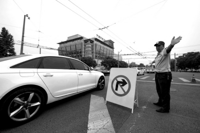 王府井街口豎起“禁右”標(biāo)識(shí)。京華時(shí)報(bào)記者趙思衡攝