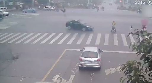 監(jiān)控視頻顯示,26日上午7時(shí)16分許,阜陽(yáng)市阜南縣“富陂大道”與“谷河路”交口,發(fā)生一起交通事故。一名身穿反光背心的執(zhí)勤輔警在斑馬線上被一輛快速駛來(lái)的黑色轎車撞飛,該輔警在空中翻轉(zhuǎn)3圈后摔在地上。該車又撞上一名行人和一輛白色轎車后停下。