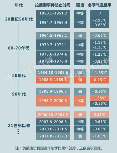 譬如,拉尼娜影響年份里,1954年冬天是其中最冷的一個冬季,氣溫比常年偏低2.95℃。