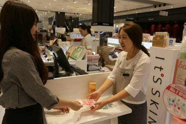9月22日,在明洞一家化妝品商店使用人民幣購物的中國游客。新華社記者姚琪琳攝