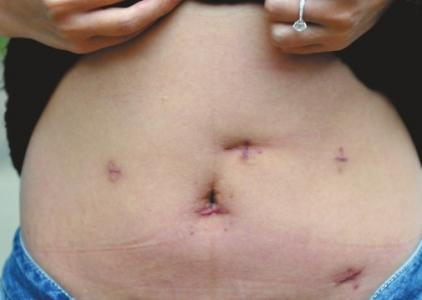 至此,鄭女士一共經(jīng)歷了三次手術(shù)。掀開上衣,鄭女士指著肚上多處縫合傷口說:“本來只有3個小孔,現(xiàn)在變成了6個洞,而且有3處打開、縫合了3次。”