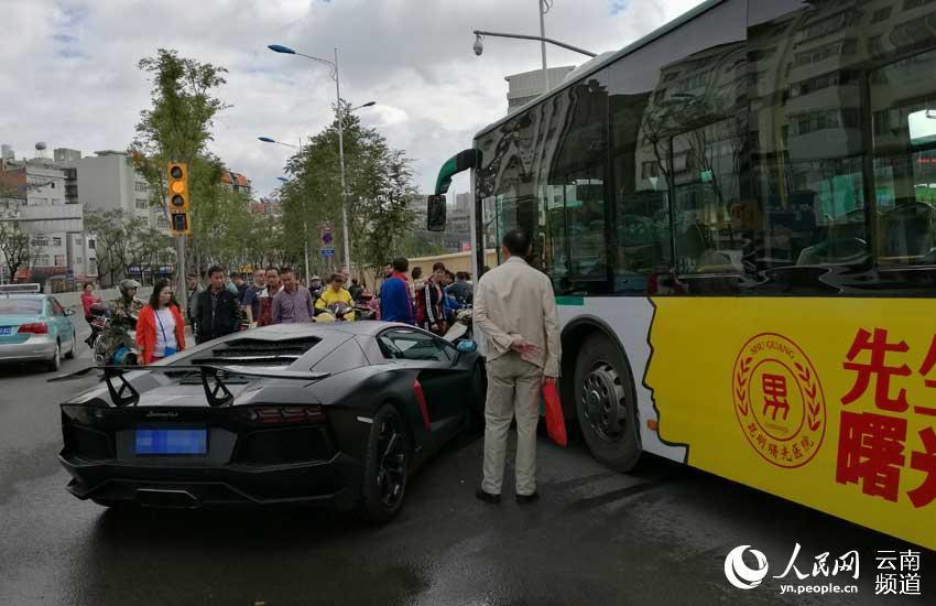 10月27日9時許,在昆明市西壩路與永樂路交叉口,發生一起公交車與蘭博基尼跑車相撞的交通事故,引得路過的市民駐足圍觀。目前交警已趕往現場處理,交通事故原因待進一步調查。記者 徐元鋒 圖片來源:人民網