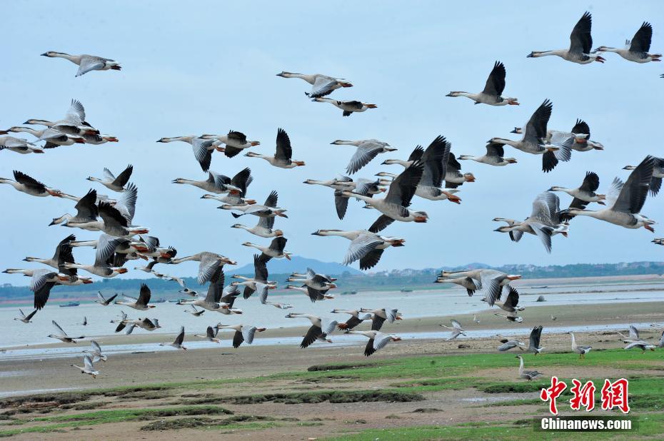 10月29日,大批鴻雁飛抵江西省鄱陽縣白沙洲鄉鄱陽湖濕地覓食越冬,場面蔚為壯觀。連日來,受近期冷空氣影響,中國最大淡水湖江西省鄱陽湖,迎來了大批鴻雁飛抵越冬。在鄱陽縣白沙洲國家級鄱陽湖濕地公園濕地草洲,成千上萬只候鳥陸續飛抵覓食棲息。目前,當地正全力做好候鳥保護工作,確保候鳥在鄱陽湖安全越冬。 卓忠偉 攝