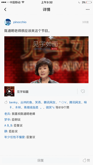 “有質感”,“有內涵”,“錘擊內心”,“第一次看到這樣新穎的節目”,“絕對是2016年最后的驚喜”,“今年最值得傳播的節目”,“在2016年最好的、最有意義的一檔節目”……網友如此評價《見字如面》,并稱這是一檔能夠給人帶來靜謐的節目,“可以讓人思考、自修“,并讓人“突然覺得好像互聯網之外的中國是個不一樣的中國啊”。