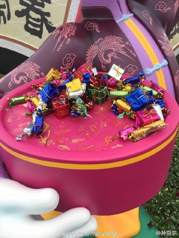 近日,微博網友 @孫豆爾爆料,由于春節將至,上海迪士尼在城堡前弄了一個“金雞鬧春”的景觀供游人互動拍照。本來是挺好的一件事,偏偏有人把唐老鴨手上的糖果弄下來拿走了!