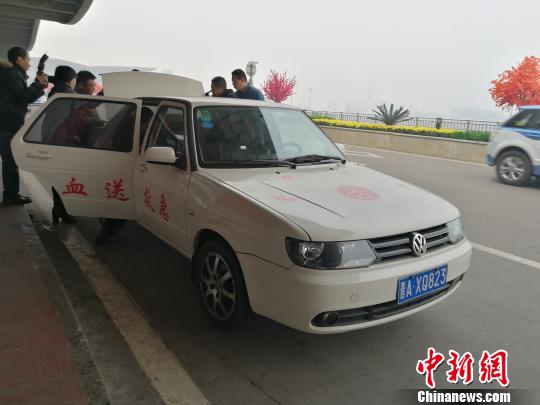 16日上午八時許,太原市紅十字血液中心急救送血車載著一袋裝有400ml稀有血型的血袋,從太原機場急速駛向醫院。 范麗芳 攝