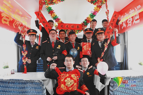 1月16日17時許,在列車“春晚”開始前,四川首趟“共青團(tuán)號”廣州至成都的K4570次增開列車部分乘務(wù)人員合影留念。胡志強(qiáng) 攝