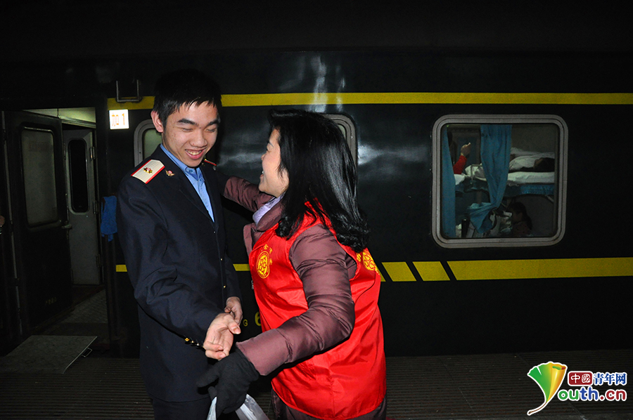 18點23分,k581次列車在站臺上停穩。18號車廂走出一位帥氣的小伙子,瘦小的身材站在18號車門旁,認真的維持上下旅客的秩序。當程新洲這位特別的乘客出現時,這個不滿20的男生微微驚訝,緊張而害羞的低了下頭。一聲的呼喚,眼淚蓄滿眼眶;一個溫暖的擁抱,溫暖了整個冬季。待旅客上下完畢后,程新洲立即上前給了他一個大大的擁抱,而看到記者,邵杰勻又害羞的低下了頭。