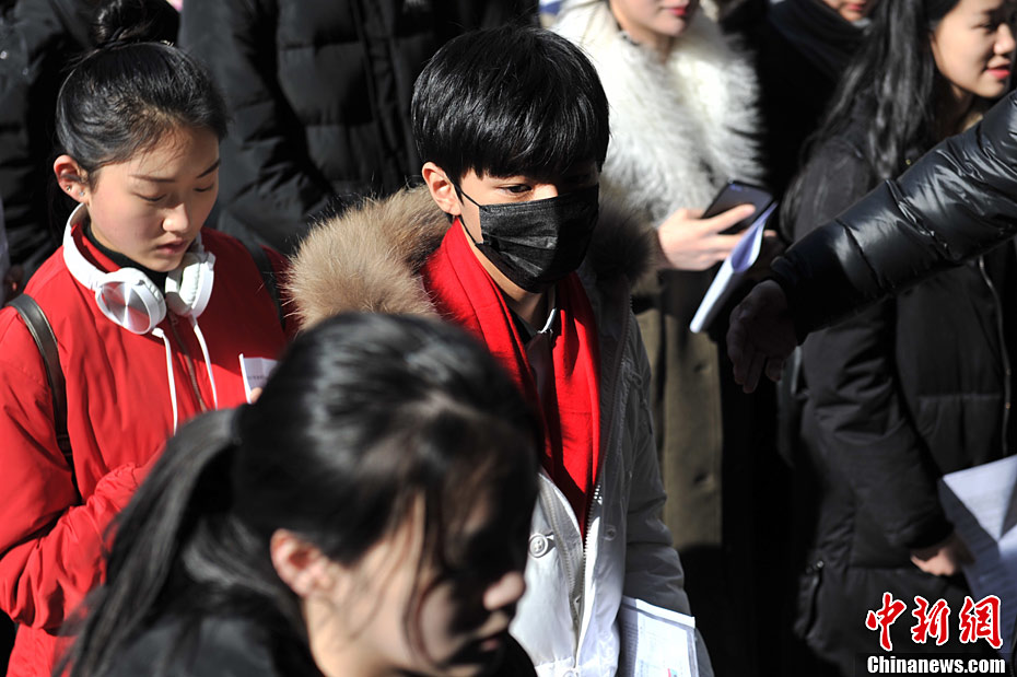2月10日下午,人氣偶像TFBOYS中的王俊凱一身白色羽絨服,口罩遮面現身北京電影學院表演專業考場,眾多粉絲瘋狂圍堵。中新網記者 金碩 攝