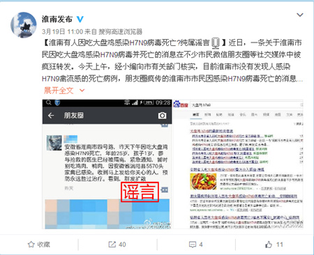 連日來,微博、微信朋友圈有消息稱:“淮南一市民昨天下午因吃大盤雞感染H7N9死亡,25歲,孩子1歲,參與搶救的醫(yī)生已被隔離,緊急通知,暫時別吃雞肉鴨肉。因安徽渦陽縣5570頭家禽已感染。收到馬上發(fā)給你關(guān)心的人,預(yù)防永遠勝過治療。看到,群發(fā)擴散。”19日,安徽省淮南市人民政府通過官方微博辟謠稱:“目前淮南市沒有發(fā)現(xiàn)人感染H7N9禽流感的死亡病例,朋友圈瘋傳的淮南市市民因感染H7N9病毒死亡的消息為假消息。