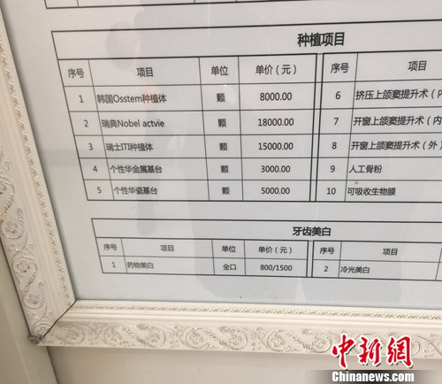 圖為北京一私立醫院的種牙項目價格。呂春榮 攝