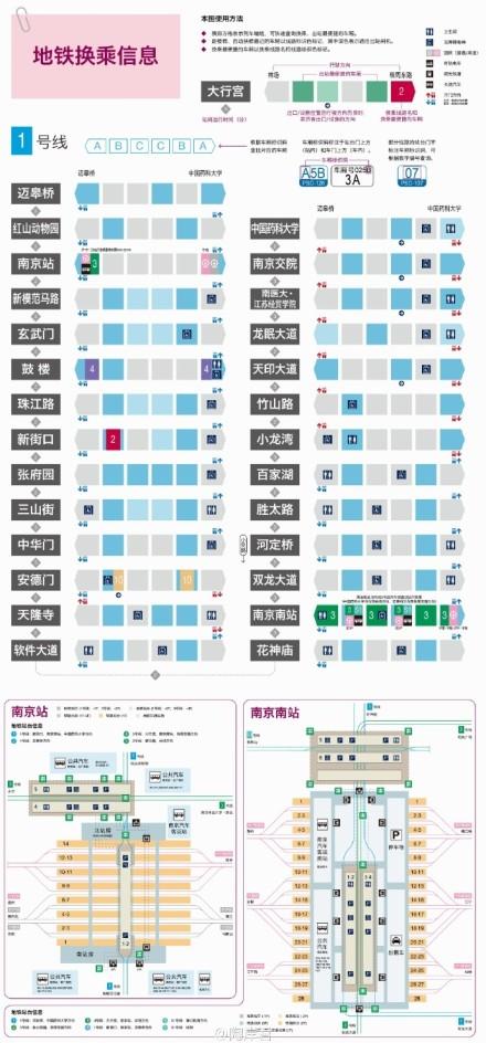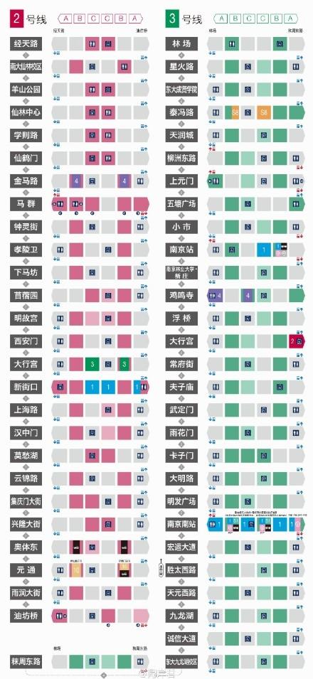 這是東南大學(xué)85后青年教師陶岸君花了一年多時間調(diào)查完成的。表中不僅用不同顏色標(biāo)注了南京地鐵的不同線路,每個車站,還標(biāo)注了哪個車廂離換乘口和出站閘機(jī)最近,哪個車門能直達(dá)自動扶梯無障礙電梯和洗手間,站與站之間大概行駛時間……