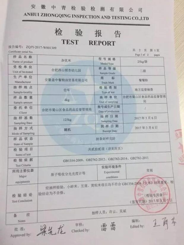 3月19日,合肥市政府發(fā)布了對于食品取樣的檢測報告,稱幼兒園食用大米的抽樣檢查為“不合格”,但食藥監(jiān)局對家長們解釋稱:“這些米沒有毒,只是不合格、以次充好而已。”