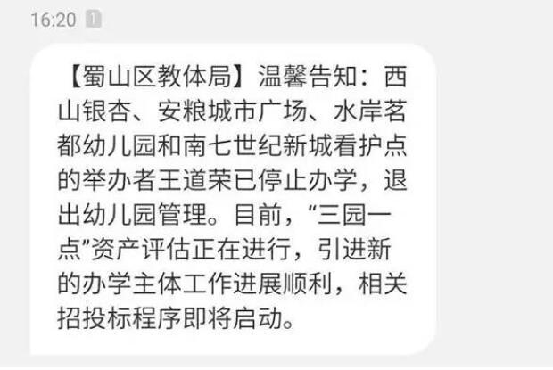 3月25日,王敏告訴澎湃新聞記者,蜀山區(qū)教體局給家長們?nèi)喊l(fā)了一條短信,稱:“西山銀杏、安糧城市廣場、水岸茗都幼兒園和南七世紀新城看護點的舉辦者王道榮已停止辦學(xué),退出幼兒園管理。”