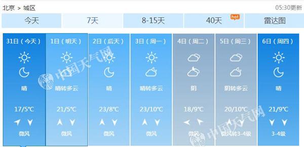今天白天,北京以晴間多云為主,陽光充足,氣溫也隨時(shí)回升,最高氣溫在17℃左右。北京市氣象臺預(yù)計(jì),今天白天北京晴間多云,午后到傍晚山區(qū)有分散性小陣雨,北轉(zhuǎn)南風(fēng)二三級,最高氣溫17℃;夜間晴間多云,南轉(zhuǎn)北風(fēng)二三級,最低氣溫5℃。