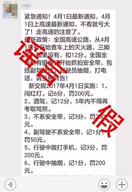 有群發消息稱,4月,將有新交通法規開始實施。新規包括“闖紅燈記6分,罰200元”;“不系安全帶記3分,罰200元”等內容。