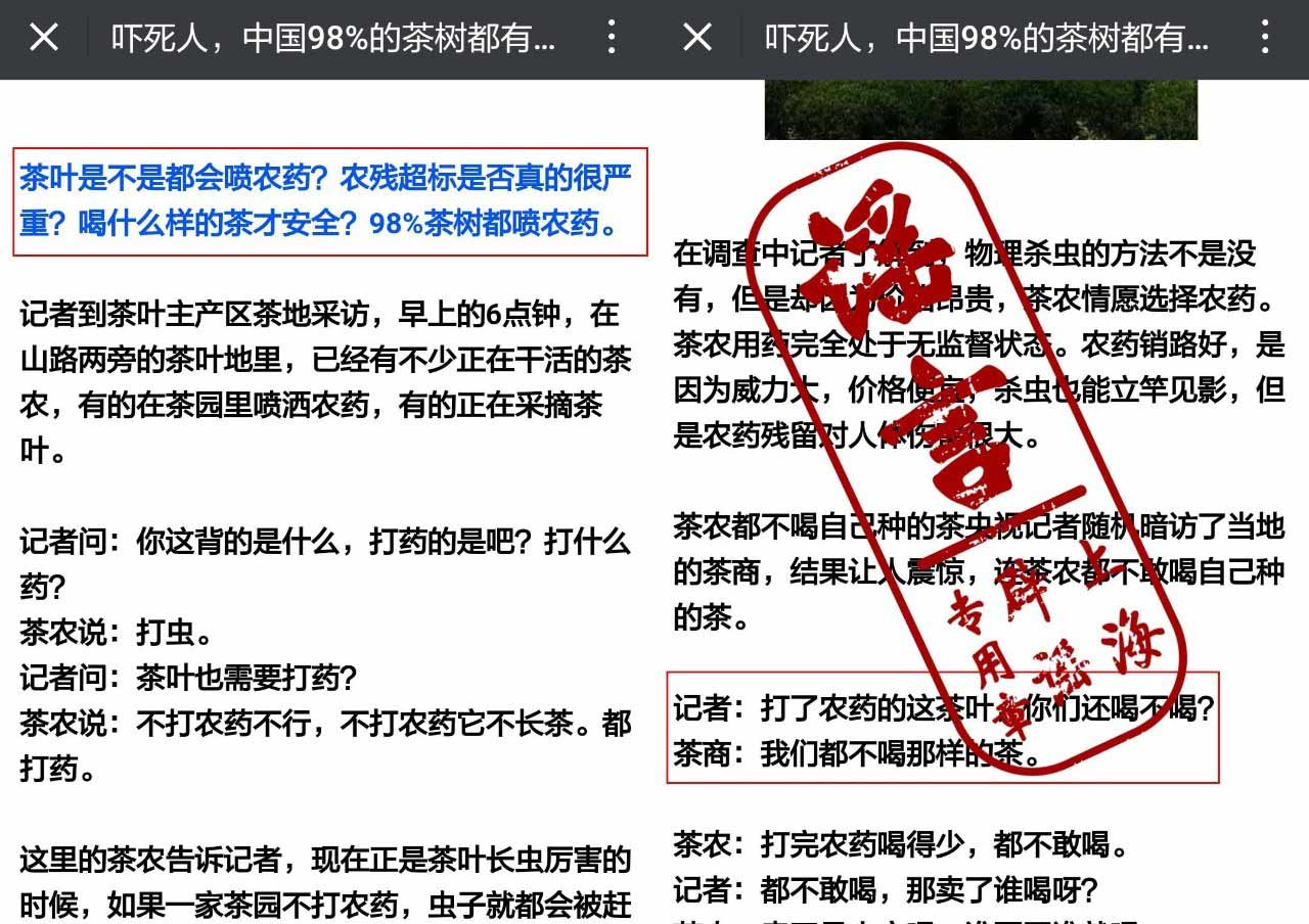 春茶中含過量農藥,一喝就中毒。而夏秋季的茶葉更是可怕,連茶農自己都不喝。文章還指出,中國茶葉98%有農殘。