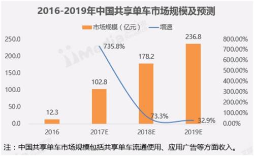iiMedia Research(艾媒咨詢)數(shù)據(jù)顯示,2016年中國共享單車市場規(guī)模為12.3億元,預(yù)計(jì)在2017年將達(dá)到102.8億元,增長率高達(dá)735.8%;而用戶規(guī)模為0.28億人,預(yù)計(jì)在2017年將達(dá)2.09億人,增長率亦有646.4%,中國共享單車市場將繼續(xù)保持超高速增長。