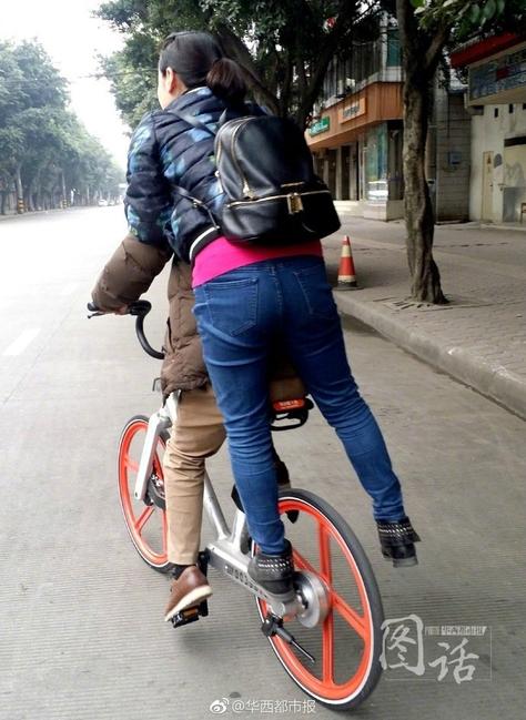 最近,成都的共享單車界,出現一波“花式載人”的節奏:有坐車筐上的,有站鏈條蓋上的,有站(坐)后輪胎蓋上的,還有倆人“共享”車座的……