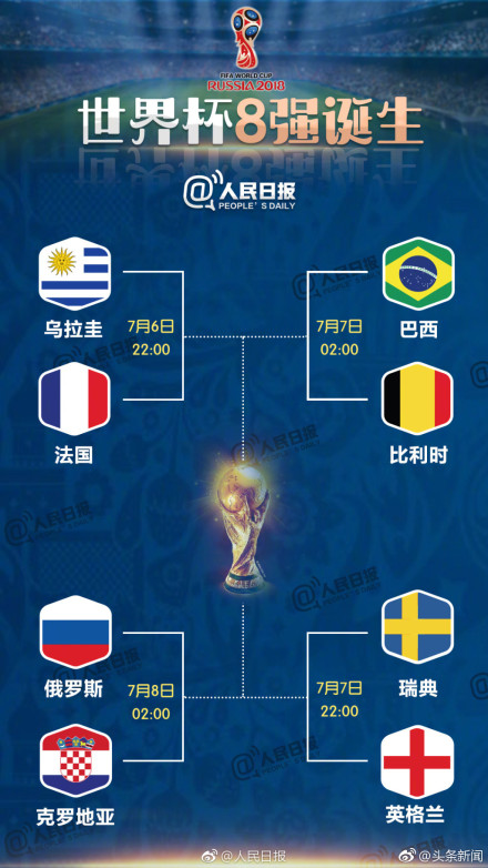 當地時間3日,2018俄羅斯世界杯1/8決賽繼續進行,瑞典隊和英格蘭隊分別戰勝瑞士隊和哥倫比亞隊晉級。至此,2018年世界杯8強全部誕生,分別是——烏拉圭、法國、俄羅斯、克羅地亞、巴西、比利時、瑞典、英格蘭。(人民日報)