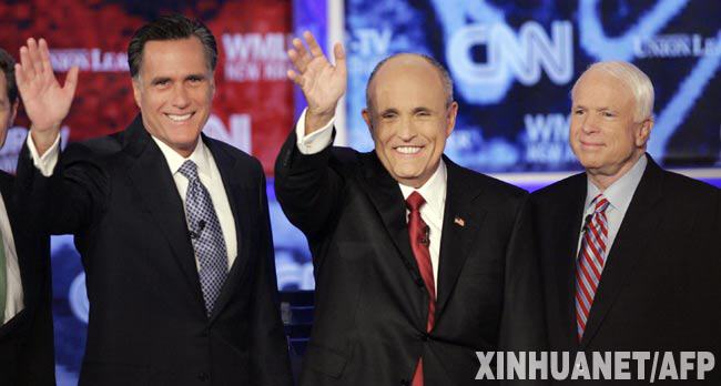6月5日,前馬薩諸塞州州長米特·羅姆尼、前紐約市市長魯?shù)婪颉ぶ炖麃喣帷喞D侵萋?lián)邦參議員約翰·麥凱恩(從左至右)在美國新罕布什爾州的圣安塞爾姆學(xué)院參加集體辯論。當(dāng)日,已宣布將參加2008年美國總統(tǒng)選舉的10名共和黨候選人在圣安塞爾姆學(xué)院進(jìn)行了一場集體辯論。 新華社/法新