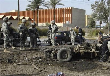12月5日,駐伊拉克美軍士兵正在查看一處汽車炸彈襲擊現(xiàn)場。當天美國國防部長在當?shù)卦L問。