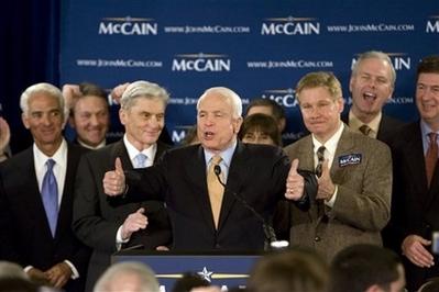 美國總統(tǒng)大選共和黨參選人麥凱恩在獲得弗吉尼亞州、馬里蘭州和華盛頓特區(qū)的初選勝利后,與支持者們一起歡呼。