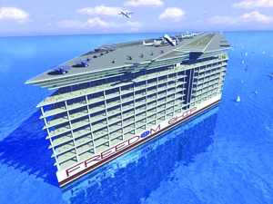 美國“自由之船國際公司”正打算建造一座史無前例的“世界最大的超級郵輪”——“自由之船”。它1400米長、37層樓高,個頭相當于目前全球最大郵輪“瑪麗女王二世”號的4倍。船上有多達1.8萬套“海景房”、劇院、賭場、商業中心,甚至還有機場、學校和醫院,可供6萬人同時居住。事實上,“自由之船”的外形已不像任何一艘現有的巨型郵輪,倒更像是科幻小說中漂浮在海面上的“機器島”——億萬富豪們可以常年“定居”在這座“海上城市”上,環繞世界各地海洋漂流!據設計師稱,“自由之船”總造價估計高達110億美元,有望在3年內完工。