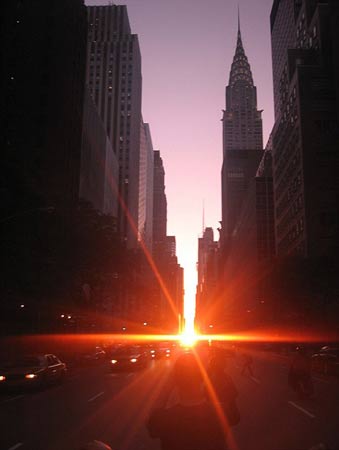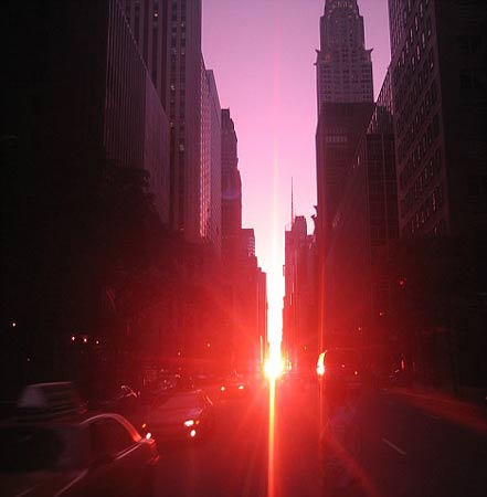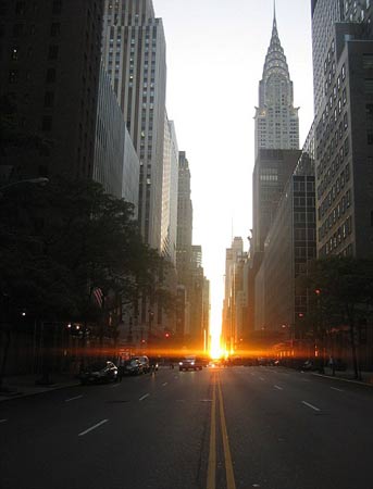據(jù)報道,該景觀一年僅有兩次,而且還不是年年都有,整個紐約不夜城便沐浴在陽光下。在“曼哈頓懸日”出現(xiàn)的這幾天里,當(dāng)太陽落下時,在紐約曼哈頓地區(qū)的格網(wǎng)街道的排列形式就如同巨大石柱群布局一樣。