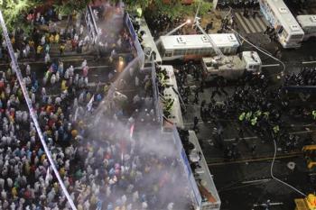 為了防止抗議者接近總統府,警方設置了路障,并再次動用高壓水龍,借以驅散示威者。很多韓國民眾認為,現政府為了與美國達成雙邊自由貿易協定就屈服于美國方面的壓力。