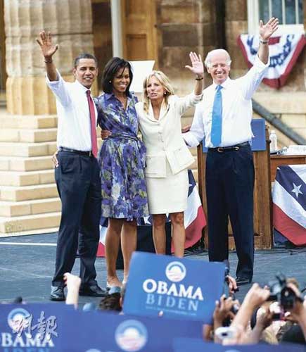 民主黨總統候選人奧巴馬(左)周六在斯普林菲爾德首次跟拜登(右)以競選拍檔身分一起拉票。奧巴馬夫婦跟拜登夫婦向支持者揮手致意。(香港明報圖)