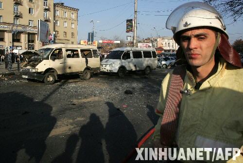 11月6日,在俄羅斯北奧塞梯的弗拉季高加索,一名救援人員站在爆炸現(xiàn)場(chǎng)。據(jù)俄羅斯安全部門稱,當(dāng)日,在弗拉季高加索,一輛公共汽車發(fā)生爆炸,造成11人死亡。 新華社/法新