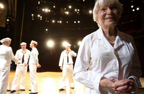 伊迪絲老太應(yīng)邀于周二參加在紐約舉行的退伍軍人節(jié)大巡游,到時(shí)會(huì)率領(lǐng)一批曾經(jīng)在第二界世界大戰(zhàn)期間參戰(zhàn)的老兵,在巡游隊(duì)伍中與群眾見面。在星期日,她穿上一套白色女護(hù)士制服,以1945年的形象露面,觀看一套音樂劇《南太平洋》。5名在劇中飾水兵、身穿全白軍服的男演員,在臺(tái)上合力把她抱起。